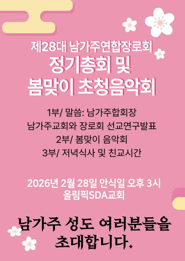 지역교회 제 28 대 남가주연합장로회 정기총회 및 봄맞이 초청음악회 페이지 정보 작성자 KCAMD쪽지보내기 메일보내기 자기소개 아이디로 검색 전체게시물쪽지보내기 메일보내기 자기소개 아이디로 검색 전체게시물 작성일2026.01.26 18:05 조회수 2,259 글씨크기 + - 본문 제 28 대 남가주연합장로회 정기총회 및 봄맞이 초청음악회 추천 0 페이스북 공유 트위터 공유 이전글창조신앙 l 별새꽃돌 강사 양성과정1 [별, 천체관측] 편 (무료 온라인특강) 26.02.05 다음글B.M.W. Newsletter 12월호 26.01.16 댓글 0 댓글목록 등록된 댓글이 없습니다. 목록