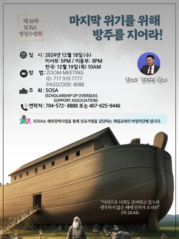 기타 제 16회 SOSA 해외장학사업회 영성세미나에 여러분을 초청합니다. 강사: 김성식 목사