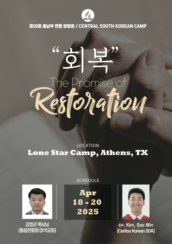 이번 중남부 연합 야영회는 "회복"에 대한 약속들을 영성있는 목사님들을 통해서 함께 살펴보고 새로운 영적인 변화를 경험하는 귀한 시간으로 중남부에 계신 여러 분들을 초청합니다.