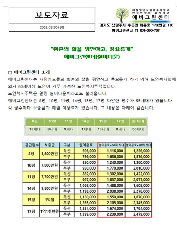 에버그린센터는 재림성도들의 황혼의 삶을 평안하고 풍요롭게 하기 위해 노인복지법에 의거 60세이상 노인이 거주 가능한 노인복지주택입니다.